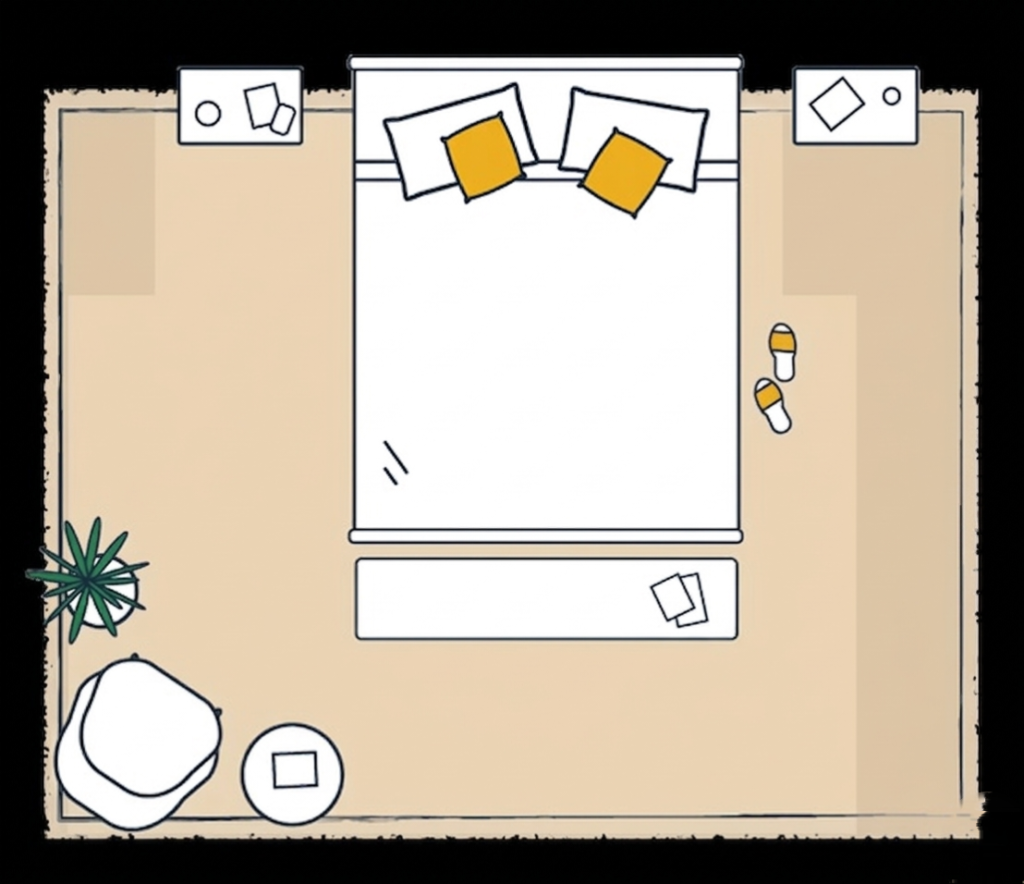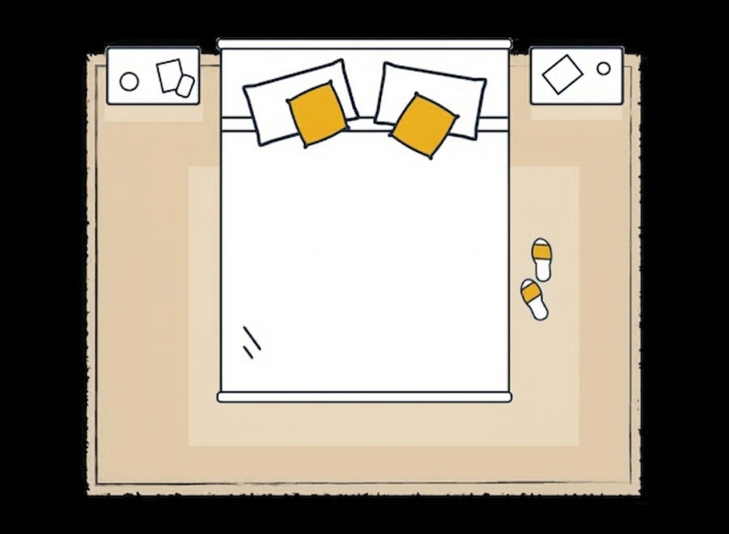 In a larger bedroom, go for a rug that reaches well beyond the edges of your bed — it ties the whole room together and gives it a warm, welcoming feel. Before choosing, measure the distance between your key furniture pieces to find a size that fits just right and brings everything into harmony.