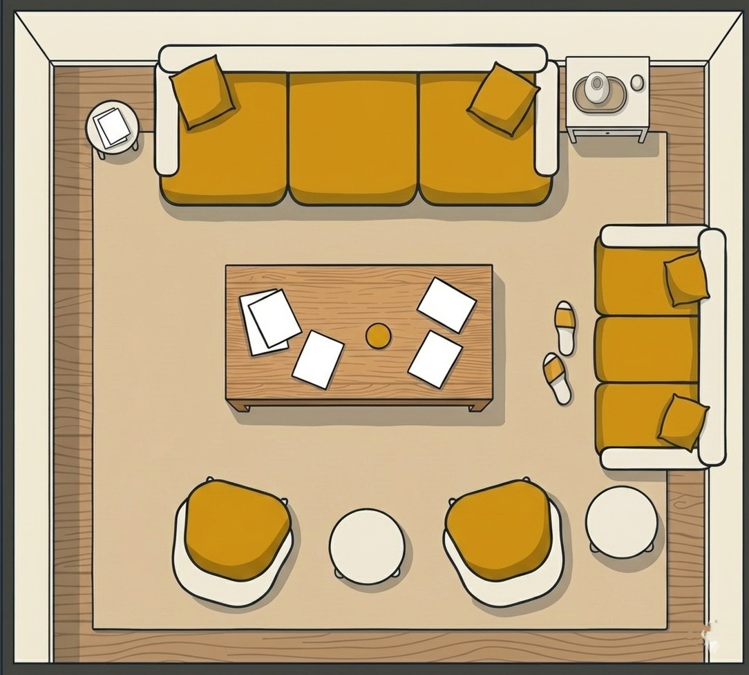 In a spacious room where furniture sits in the middle, always go for a rug that’s large enough to anchor everything together — giving your seating area a defined, open, and well-balanced feel without any sense of overcrowding.